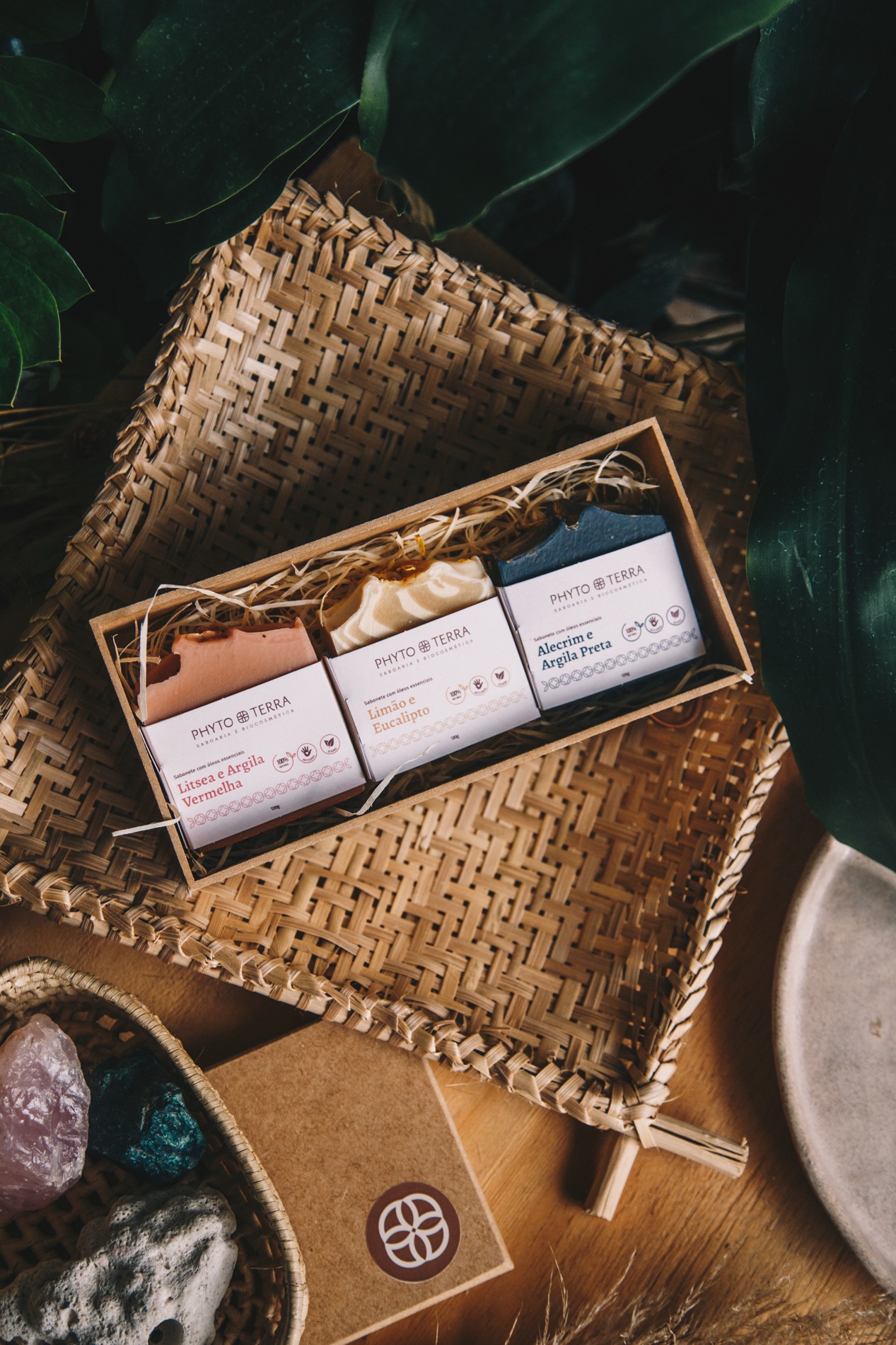 Contém 3 sabonetes sortidos em uma caixa de madeira retangular com tampa.